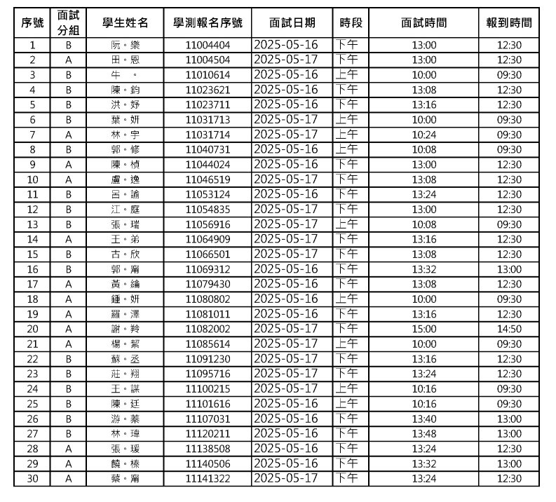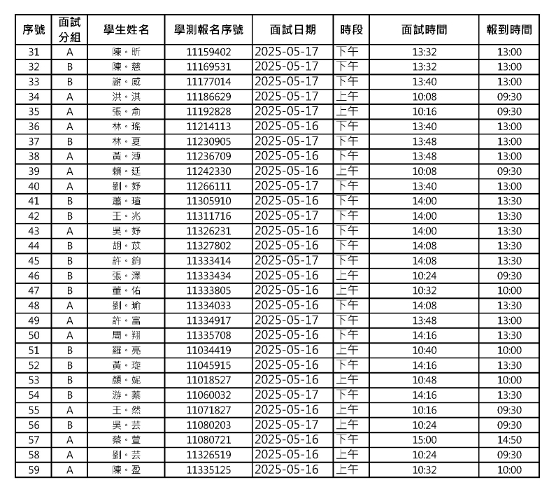 ●面試分為上、下午各2場次,面試順序皆依同學所登記時段與學測應試號碼進行分配。請同學依據公告場次報到時間進行報到,完成報到才可進行面試。
