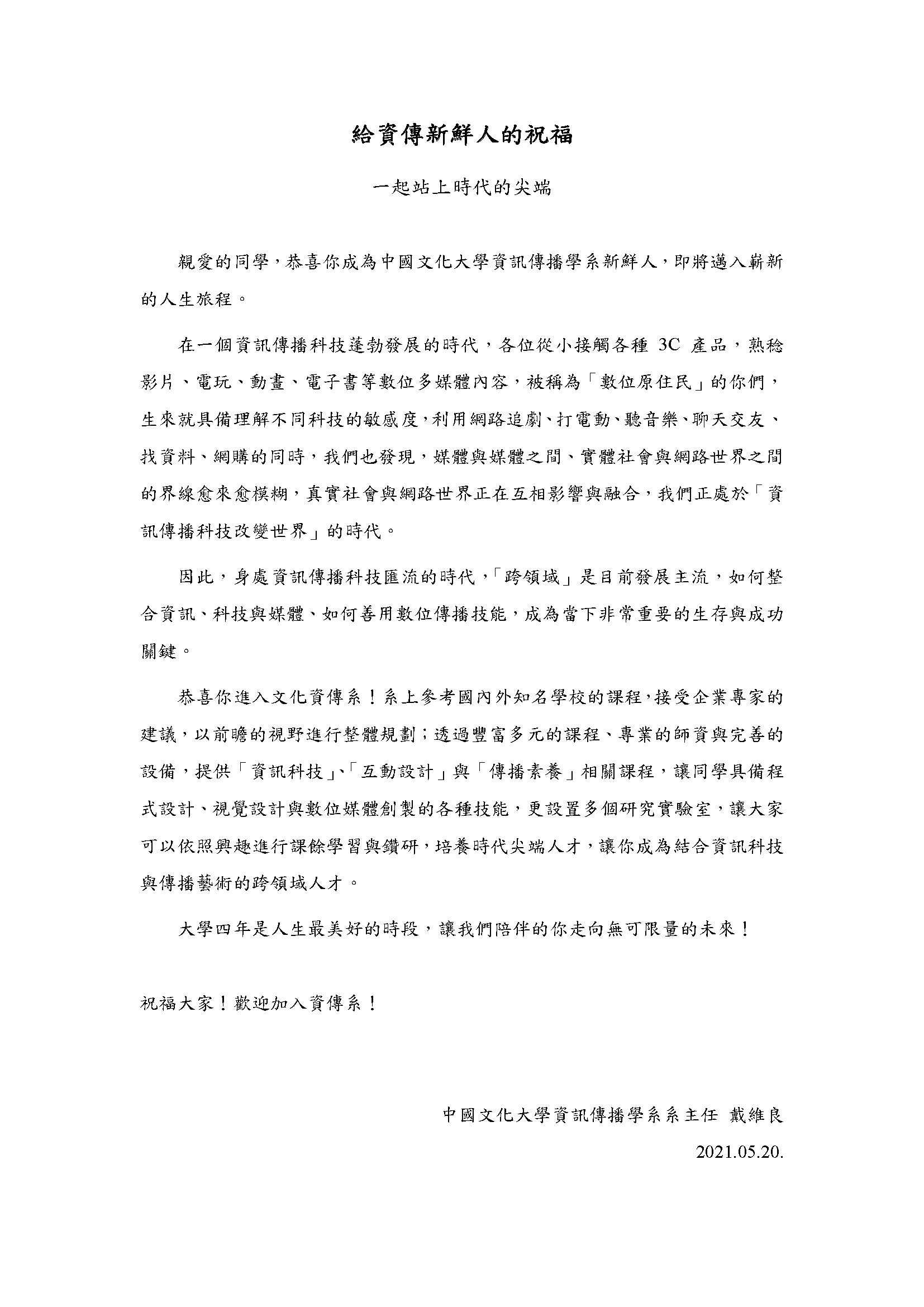 親愛的同學,恭喜你成為中國文化大學資訊傳播學系新鮮人,即將邁入嶄新的人生旅程。